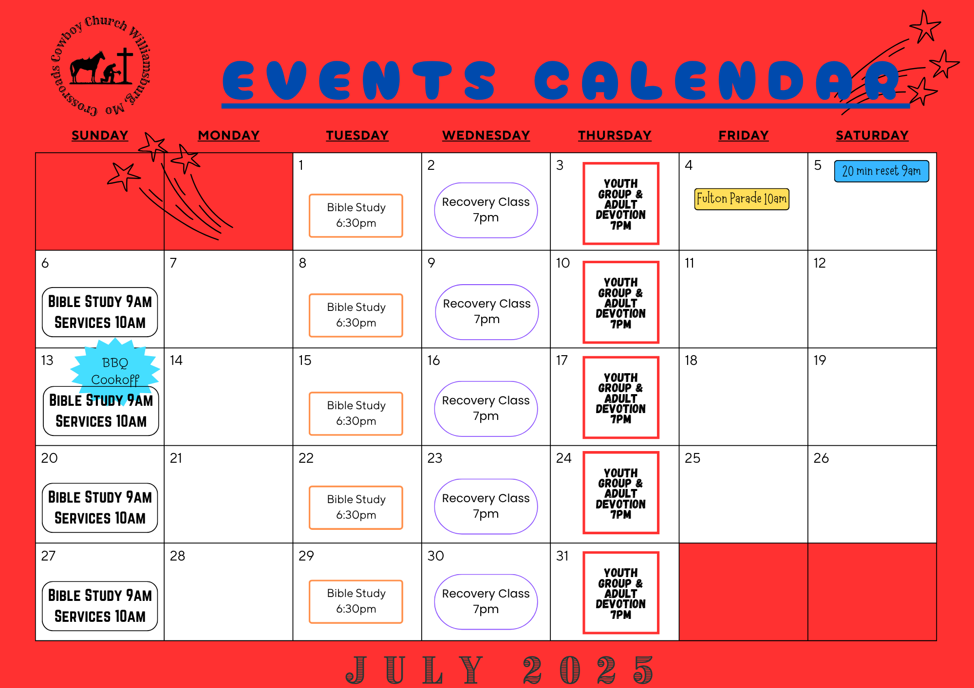 Thursdays 7 pm - youth group, Devotion and Open ride (weather permits)